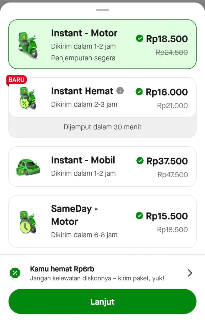 - Instant Hemat – fitur yang serupa dengan instant motor namun membutuhkan waktu tambahan beberapa jam karena kurir juga harus mengirimnya barang pelanggan lain.