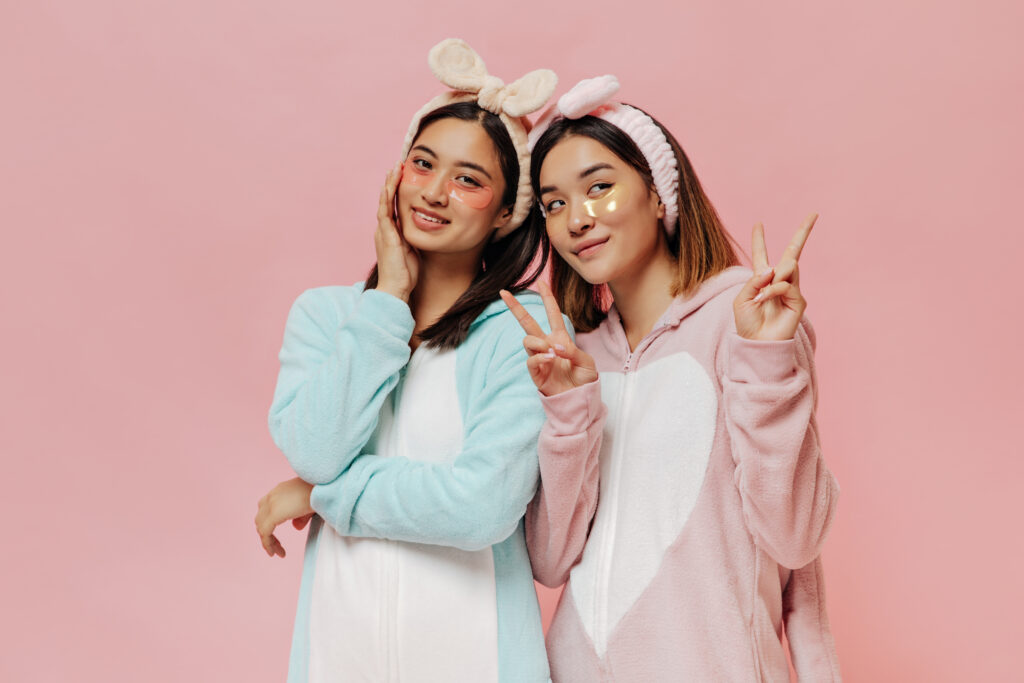 Charming Asian women in soft pajamas, headbands and with eye patches smile and show v-signs in pink background.