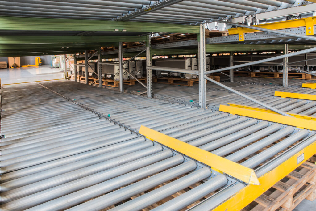 Rak yang menggunakan prinsip gravitasi untuk menggerakkan barang, cocok untuk barang yang tidak sering diakses dan untuk penyimpanan dengan sistem FIFO (First In, First Out).