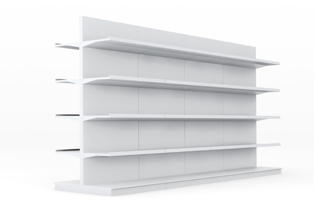 Rak yang sering digunakna di toko ritel untuk menyimpan berbagai jenis produk dengan akses mudah.