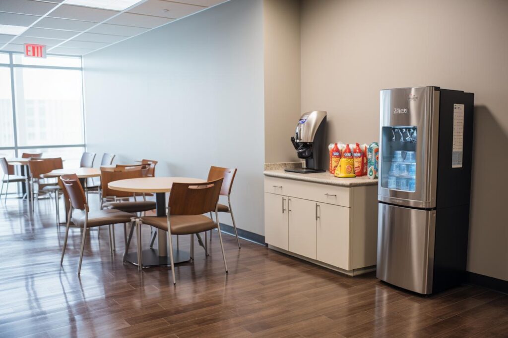 - Storing tableware, tissues, coffee/tea supplies, or office snacks. If space allows, some office pantries include a dining table with 4–8 chairs so employees can eat there—helping keep the main workspace clean while allowing staff to enjoy their meals comfortably